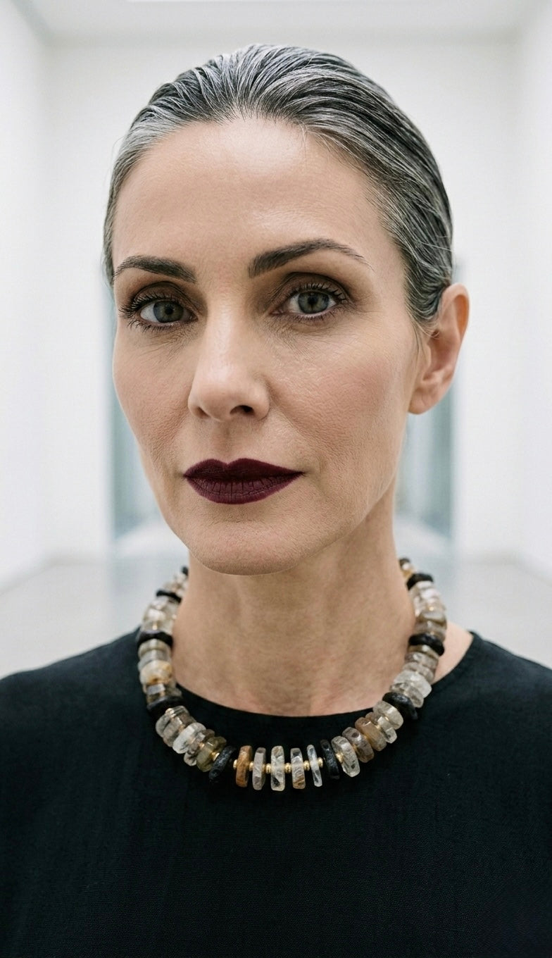 The necklace is designed to anchor the collarbone, providing a structural counterpoint to fluid silk or sharp tailoring. It does not decorate, it commands the posture.