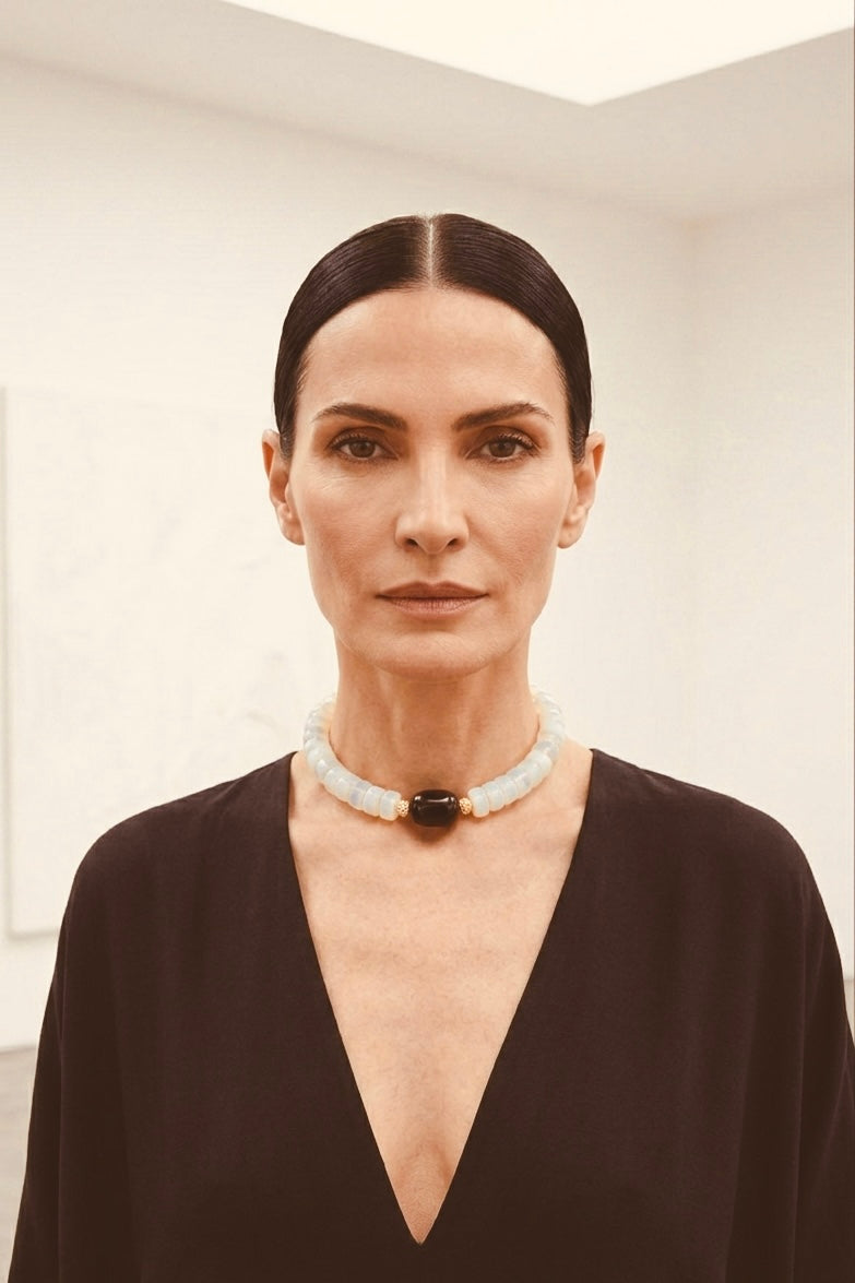 A cold, deliberate equilibrium. The opalescent glow of the moonstone acts as a pale horizon, framing the woman who remains the undisputed masterpiece. It is a piece for the woman who commands the room with a gaze that is both nostalgic and modern—controlled drama in its purest form.