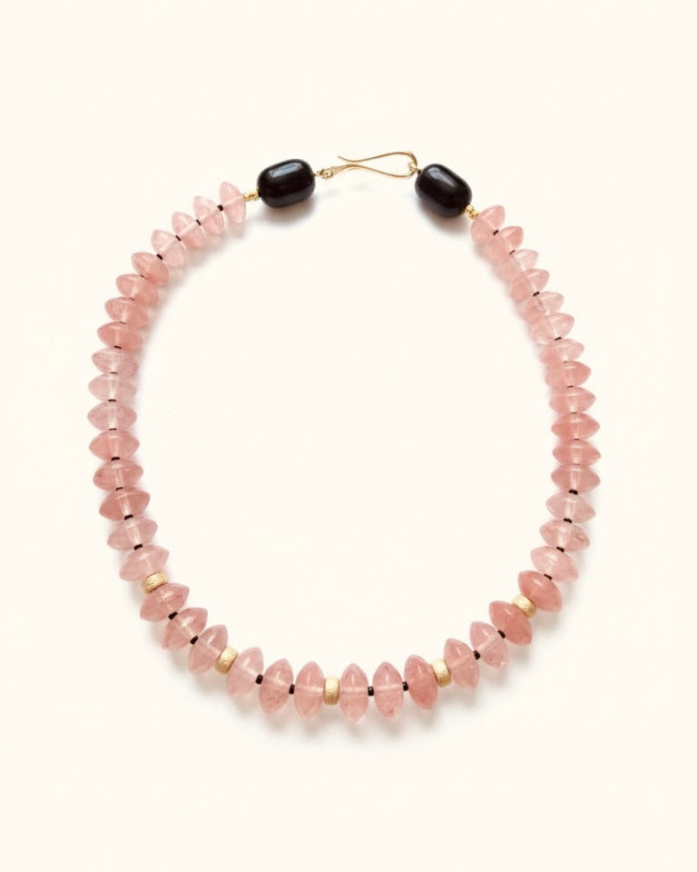 A hand-faceted sequence of rose-toned strawberry quartz. Each rondelle is unique in its mineral density, revealing natural inclusions within the stone.