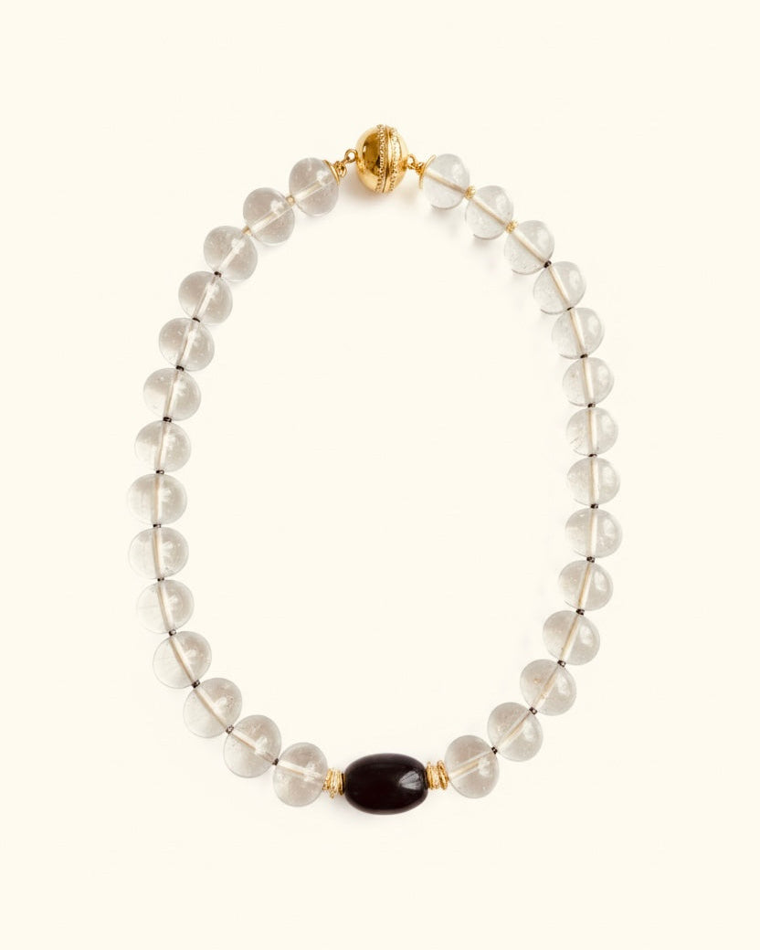A dialogue between the visible and the void. Hand-polished white crystal spheres, cold and transparent, punctuated by a singular, light-absorbing obsidian center. Cinematic contrast: the clarity of day meeting the absolute depth of midnight. A sculptural piece for the woman who finds power in the shadows.